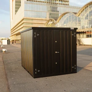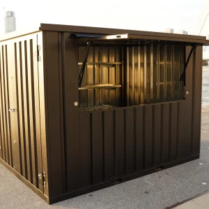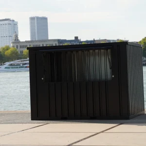 El bar exterior mide aproximadamente 3×2 metros, es de color negro RAL 9005 y dispone de un toldo plegable. Sus dimensiones son prácticamente iguales a las de un contenedor desmontable de 10 pies. Es perfecto para quienes buscan resguardarse de la lluvia y, además, otorga al bar exterior la apariencia de un auténtico bar. El toldo se puede abatir y cerrar con llave, lo que permite dejar el bar exterior con los artículos en su interior de forma segura. También incluye una puerta doble en el lado corto, que facilita la entrada de artículos voluminosos como barriles de cerveza. Es, por tanto, la solución ideal para servir bebidas a visitantes o amigos. Un bar exterior sencillo pero resistente.